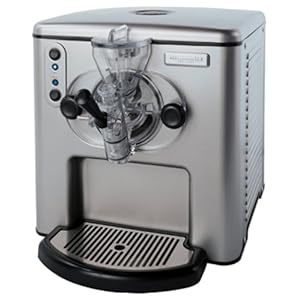 The Ultimate Frozen Dessert Maker - Pro Line by KitchenAid. Prepare a variety of delicious frozen drinks and desserts, including ice cream, frozen yogurt, sorbet, gelato, granita, and margaritas. The horizontal freezing cylinder makes it easy to control "overrun", or the amount of air mixed into a dessert. Brushed stainless steel housing is durable and easy to clean. Freezing cylinder is stainless steel for lasting performance. System begins to chill with the flip of a switch. Most desserts are ready within 30 minutes. When one half-gallon batch is finished, simply add more ingredients to start another. Unequaled convenience that's also great fun! When the freezing cycle is complete, just pull the lever to dispense frozen drinks and ice cream. Built-in funnel and ingredient pusher make it a cinch to add the initial mixture, as well as delicious fruits, nuts, or candy. The unit fits easily underneath will cabinets on the countertop. All parts and assemblies are designed to resist trapping ingredients for sanitary operation and quick cleanup. Comes with a 2-Year Hassle-Free Replacement warranty.